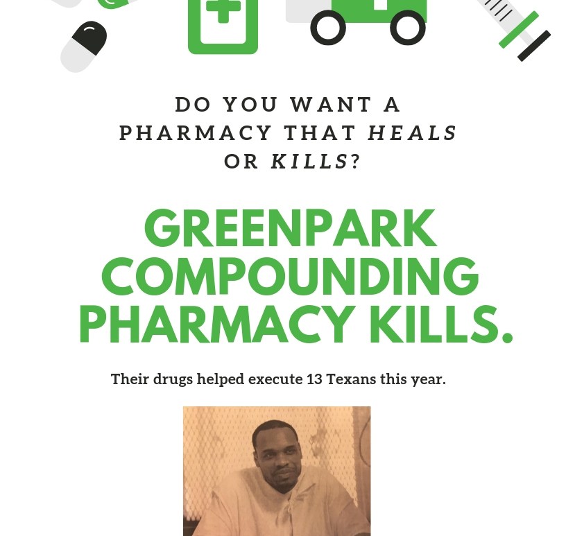 Click for a printable copy: Green park Compounding pharmacy kills   After a long fight to expose the source of Texas’ execution drugs, court documents obtained by media suggested the source as Greenpark Coumpounding Pharmacy. Buzzfeed news reported that: “Greenpark Compounding Pharmacy gave kids the wrong medicine. It forged documents. Its employees didn’t wash their hands adequately. So why did the state with the most … Continue reading Houston Pharmacy Exposed for Manufacturing Drugs to Kill Texans